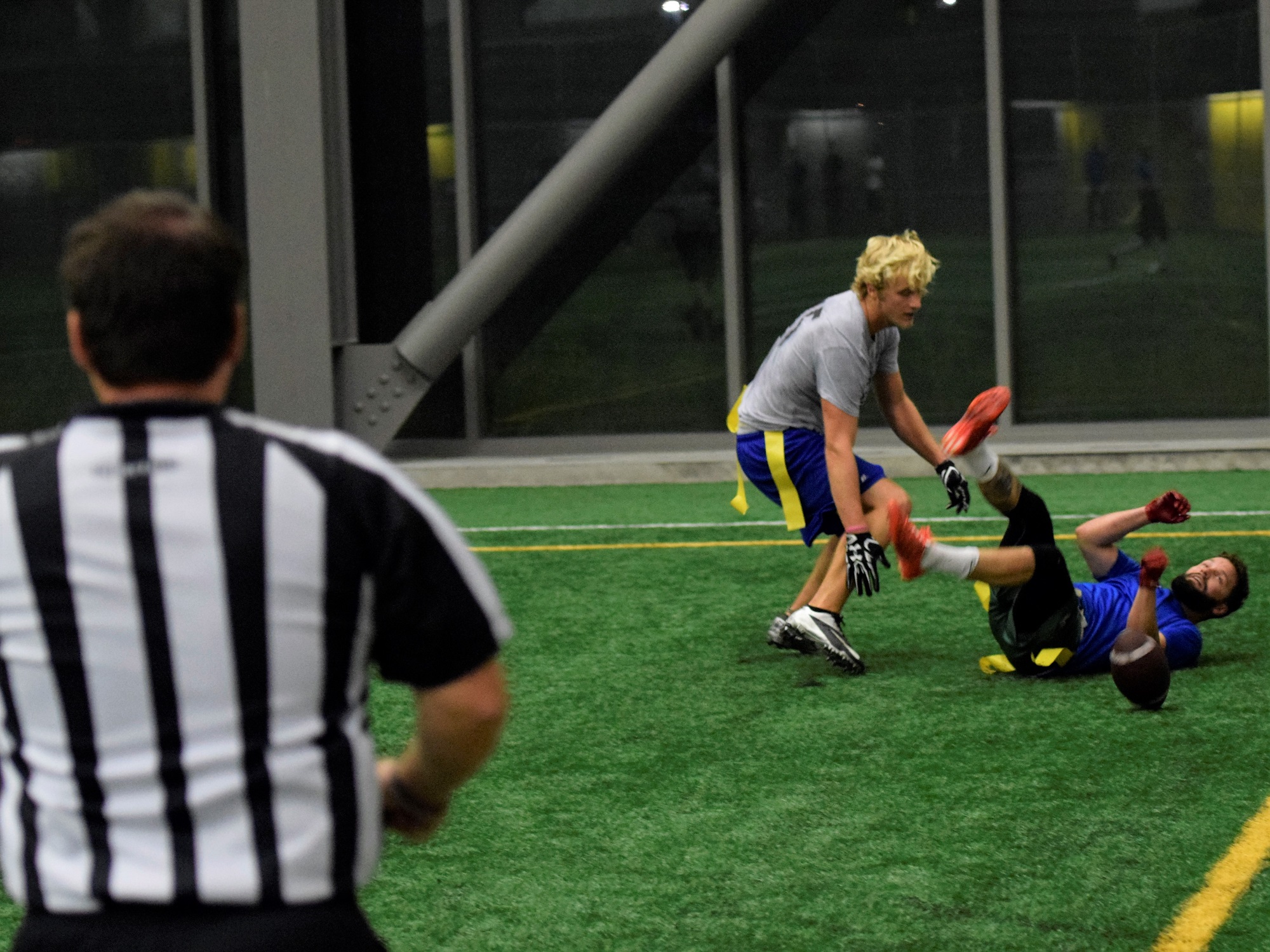 To sum up, the quarterbacks arm and body are completely off limits when it comes to passing situations, make sure to play the flags and keep the quarterbacks safe. In order to get an intentional grounding call in FPF, the quarterback must be dumping the ball to avoid a loss, meaning they are trying to avoid a sack so they just throw the ball away. This also means that throwing the ball over a receiver’s head on purpose is well within the rules provided that they are not under immediate duress at the time of the pass. We know this can be frustrating, which is in large part why we allow the offense to end the game if they are winning and can run out the remaining plays. We don’t want a quarterback launching the ball down the field 3 times and then punting to end the game.