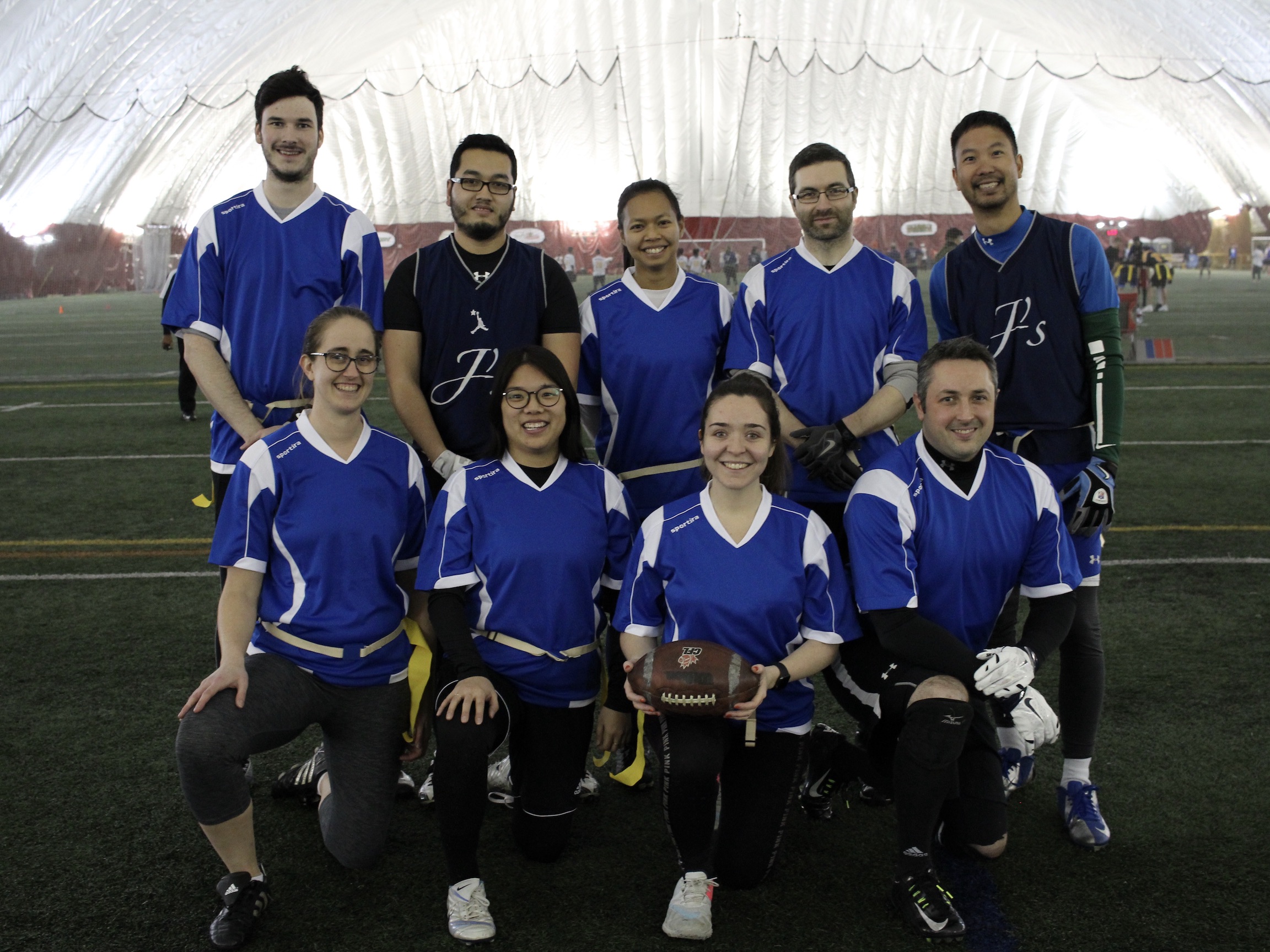 In co-ed 1, Michael Scott’s Tots surprised me by beating Sriracha Hot Chili Sauce 42-31. Both of the quarterbacks in this one had fantastic games. Evan Ely Nolet led his Tots to victory with 12 completions for 220 yards and seven scores. Most impressively, he did all that without throwing a single interception. A large part of MST’s success was due to Doug McKernan. He can only be described as a super sub. He caught seven passes for 160 yards and five scores. What a game! While MST’s offence had an incredible performance, their defence struggled to stop Sriracha Hot Chili Sauce. They only forced one punt out of their opposition. While they might have been able to win this one thanks to the prowess of their offence, this is not a formula that will work every week. They need to force a few interceptions if they hope to compete against the heavyweights in this division. Sriracha Hot Chili Sauce  also had a strong offensive showing. Quarterback Jean-Felix Marquis passed for 200 yards and five scores. Like his opposing number, he also avoided throwing any interceptions. On most nights, a five TD performance will be enough to win a game. Unfortunately, Marquis and SHCS just came across an even hotter quarterback. One thing that SHCS did well was spread the ball. The speedy Benjamin Dansereau-Leclerc led his team with six receptions for 73 yards and two scores. Alexandre Jubinville was hot on his heels with five catches for 68 yards and two scores. SHCS’s final touchdown came courtesy of Camille Ste-Marie who finished the game with 4 catches for 35 yards. All in all, this was a good game for Sriracha Hot Chili Sauce. They moved the ball with ease. If they can build on that offensive showing and tighten things up on defence, they will start winning very soon.