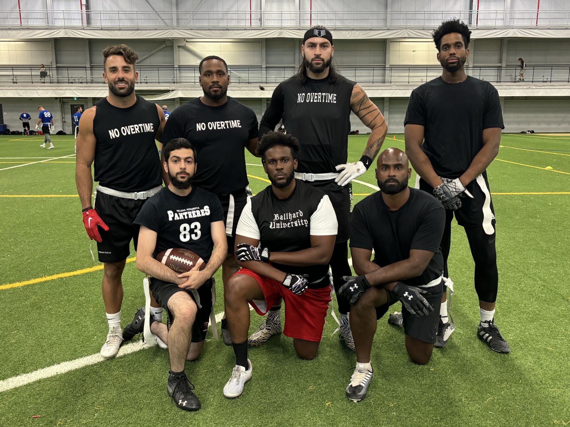 Never Overtime Quarterback Ryan Kharouf had his best game of the year as he tossed a season-high seven touchdowns, one 10 of 13 passing for 221 yards. All of his passes went to three Receivers, in Nirosh Suresh and Mack Dessources who each recorded three TDs, and Olivier Sabourin, who had one of his own.