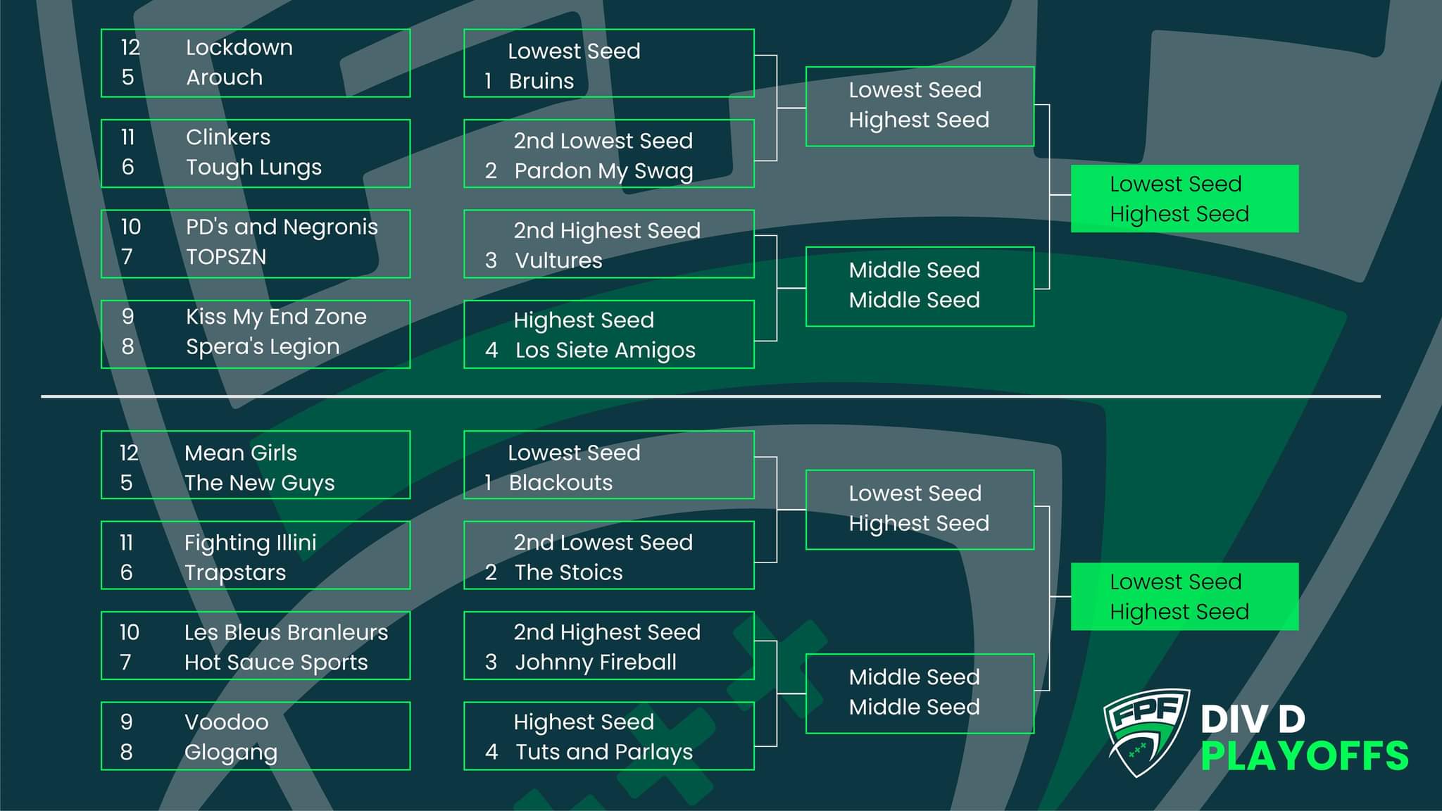 Based on the season, I would have to go with PD’S AND NEGRONIS. However, only 7 of their 13 players are eligible for the playoffs, MAX BURAH is not. TOPSZN beat PD’S AND NEGRONIS again, just like they did in week 3.
